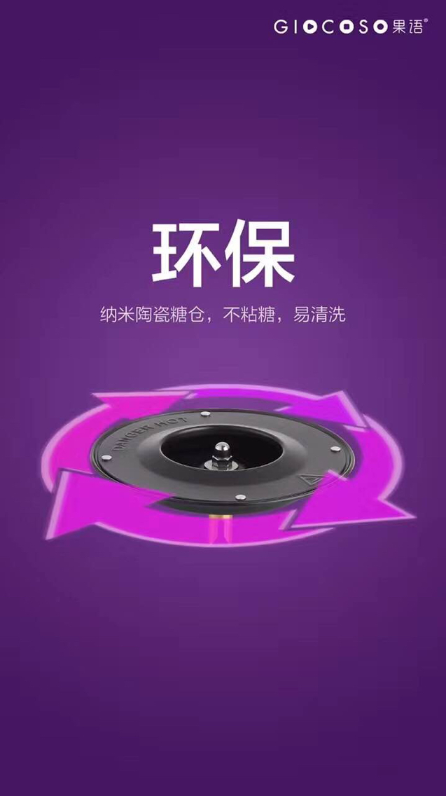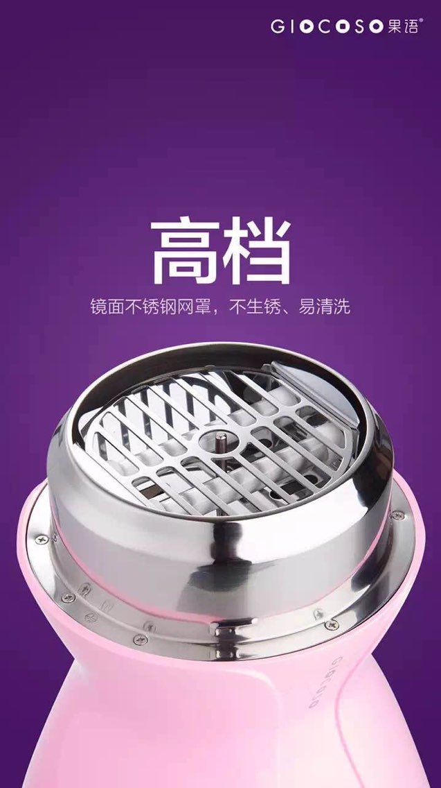 果语棉花糖机采用全新工程塑料搭配不锈钢组件制作而成,主机壳、开关按钮和开关装饰件为ABS材料,抗腐蚀、耐冲击;底板为PP材料,轻便耐高温;承接盘、承接盘罩和糖棒均为食品级PP材料,质地纯净、无毒无异味,所有塑料件均不含双酚A,妈妈们完全不用担心它们对糖体造成污染,超强韧性的糖棒保证孩子们玩的时候不断不裂,给他们以完美的棉花糖体验。