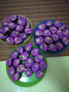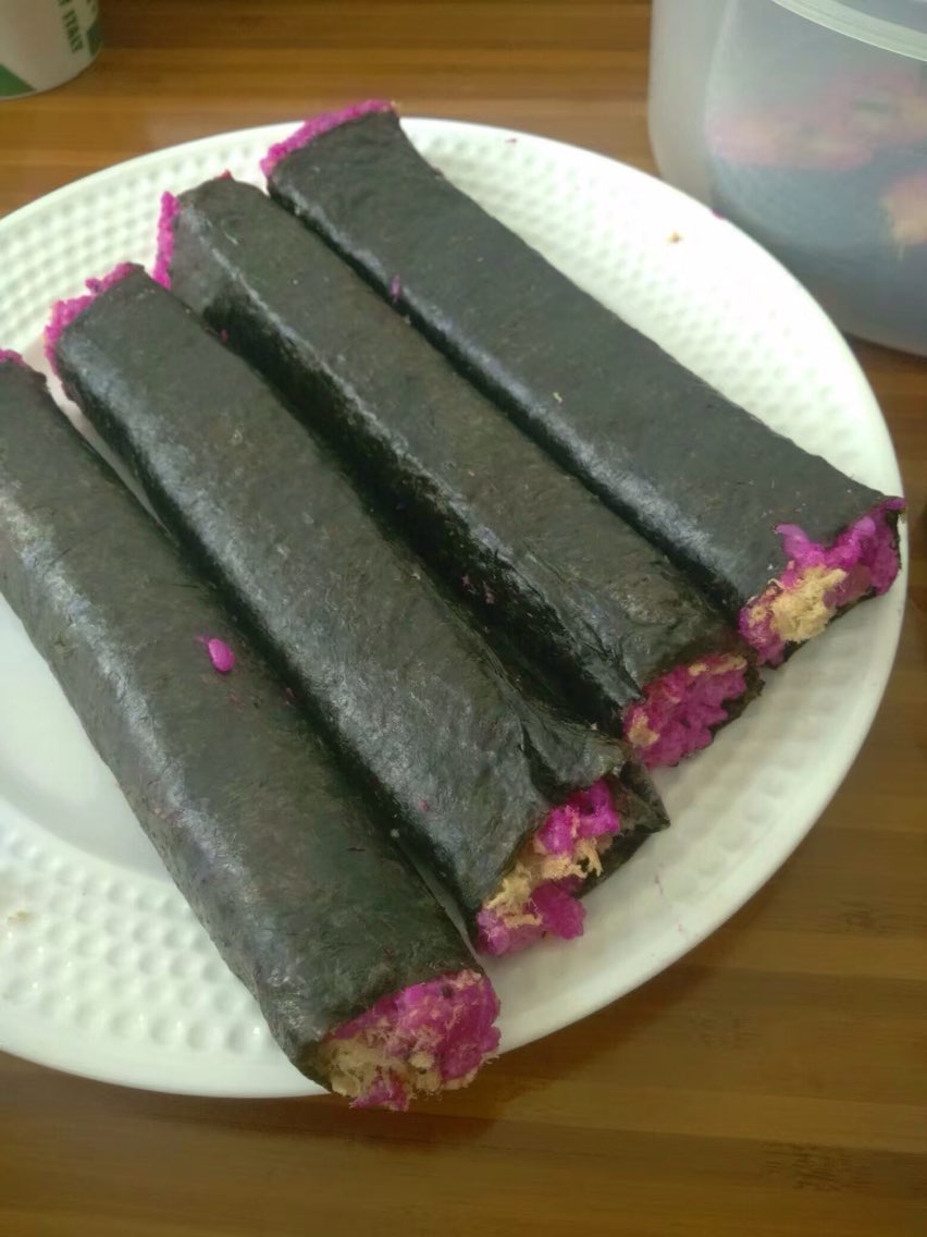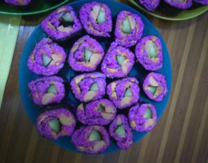 自己做的寿司真材实料,紫色是用红心火龙果做的,自己做的寿司味道好,卫生,非常受欢迎!